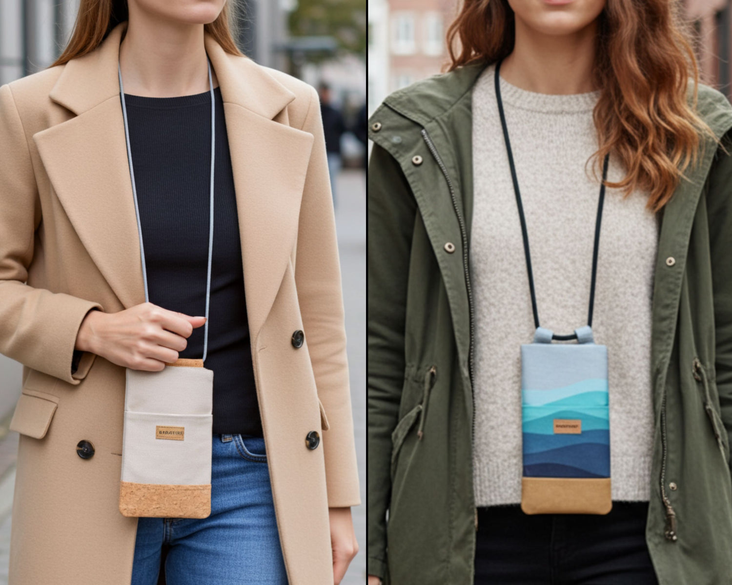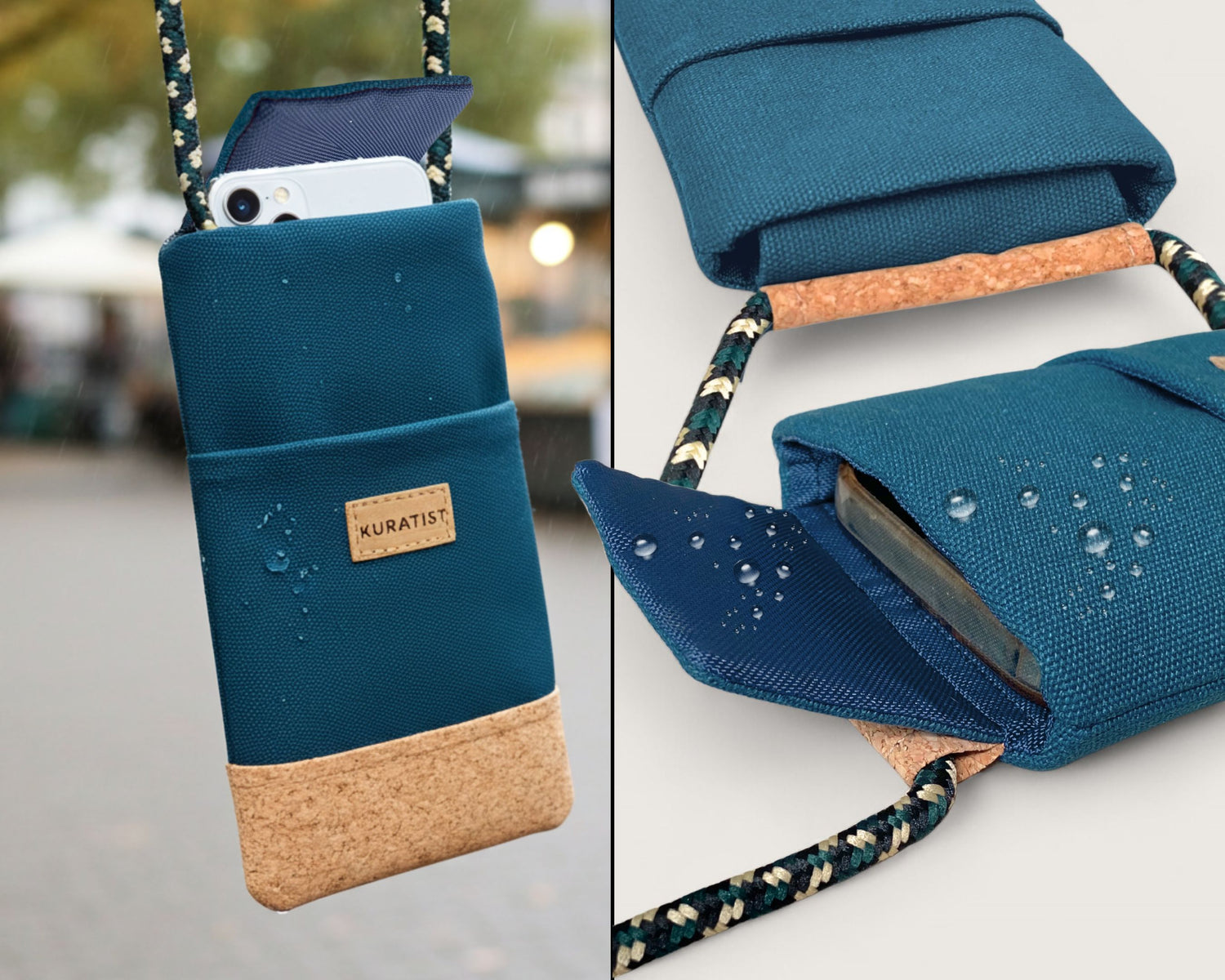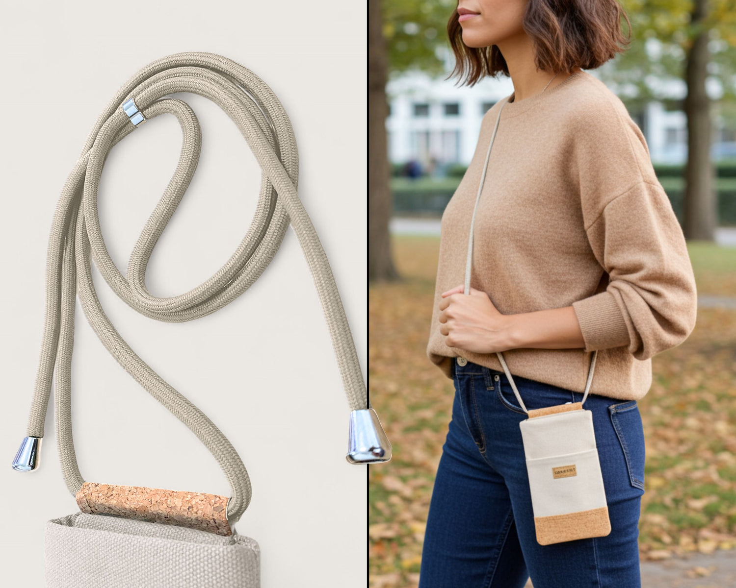 The NELA cell phone shoulder bag is made from a mix of natural, vegan materials such as robust 100% cotton canvas, water-repellent cork and tear-resistant, washable paper.