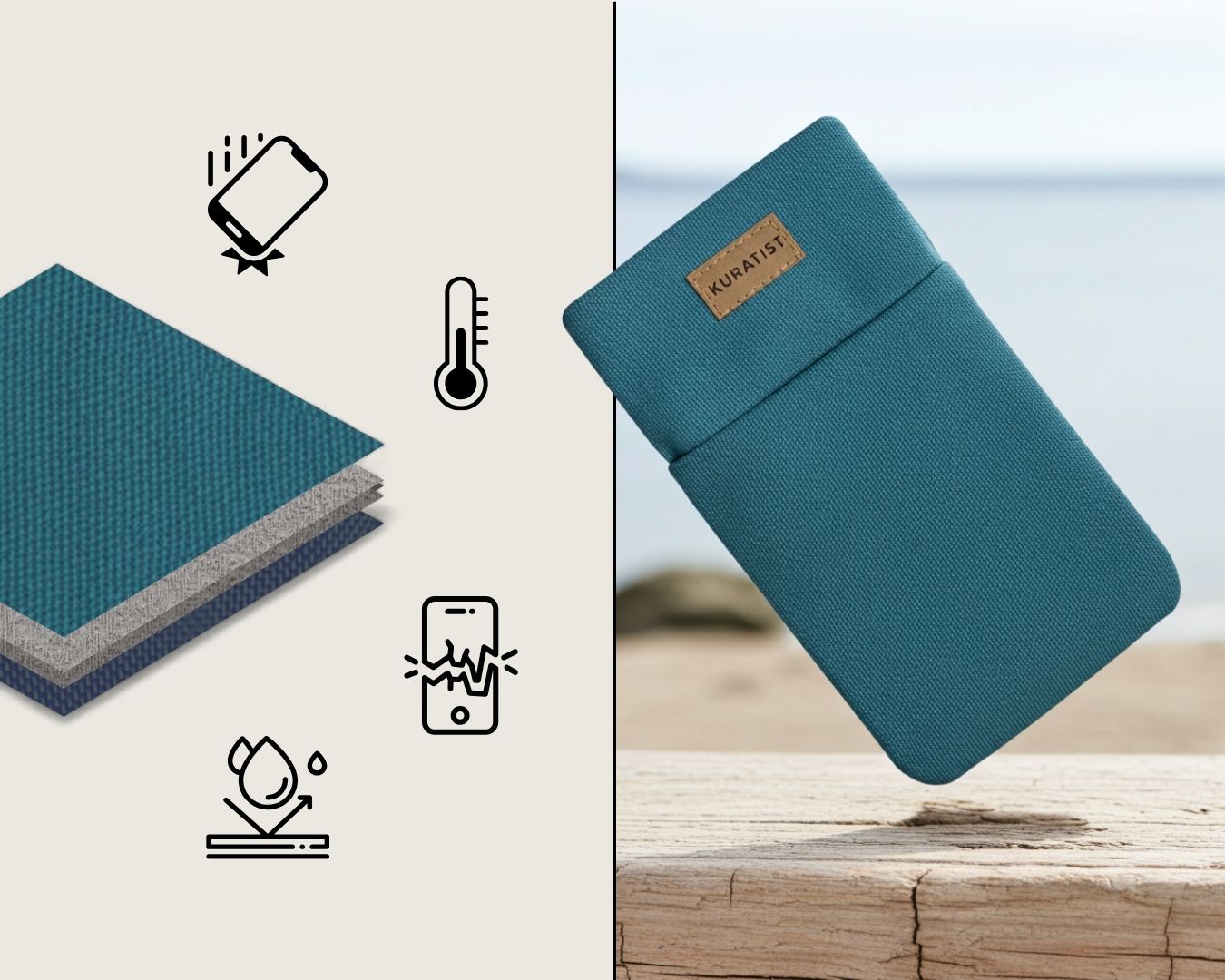 Mehrlagiges Design mit schützender Schaumstoffpolsterung, robustem Baumwoll-Canvas und wasserabweisendem Innenfutter. Schützt dein Display zuverlässig vor Kratzern, wenn du dein Handy einfach in die Tasche steckst.